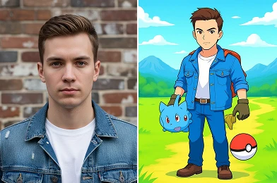 Transform your photo into a Pokémon-inspired cartoon with our AI Pokémon Generator. The AI reimagines you as a Pokémon trainer, adding bright colors, a charming Pokémon character, and a lively cartoon setting.